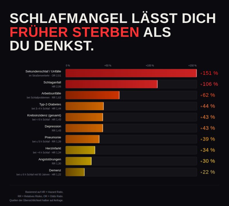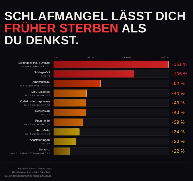 Große Kohortenstudien und Metaanalysen zeigen: Zu wenig Schlaf erhöht messbar das Risiko für zahlreiche Krankheiten. Ein paar Beispiele (Vergleich meist <6 h Schlaf vs. ~7–8 h):